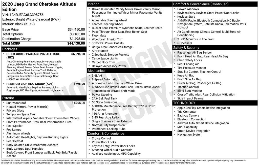 Exuding a perfect balance of rugged capability and refined sophistication, the 2020 Jeep Grand Cherokee Altitude is a true standout in its class. Experience the thrill of owning this exceptional SUV and schedule your test drive today.